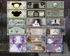 Print your own money!These thoughts, combined with the urge to try my hand at something new, inspired me to create a new series of Fluxus Bucks. To provide people with denominations that can easily be combined to create whatever value one might require, I've used the first 9 prime numbers: 2, 3, 5, 7, 11, 13, 17, 19, and 23. If you add all these together, you end up with exactly 100 Fluxus Bucks. To print: download hires-versions Or get the wallpaper: 1280x1024px