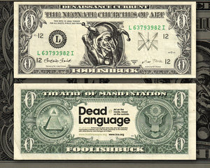 Denaissance Current - the FoolishBuck Inspired by the FoolishPeople I came up with this very special Fluxus-buck: the FoolishBuck was made both as a prop to be used during the performance of Dead Language at the ICA in London (october 2007), and as a way to pay tribute to John Harrigan and his magnificent troupe of deviants. Get the wallpaper: 1280x1024px |